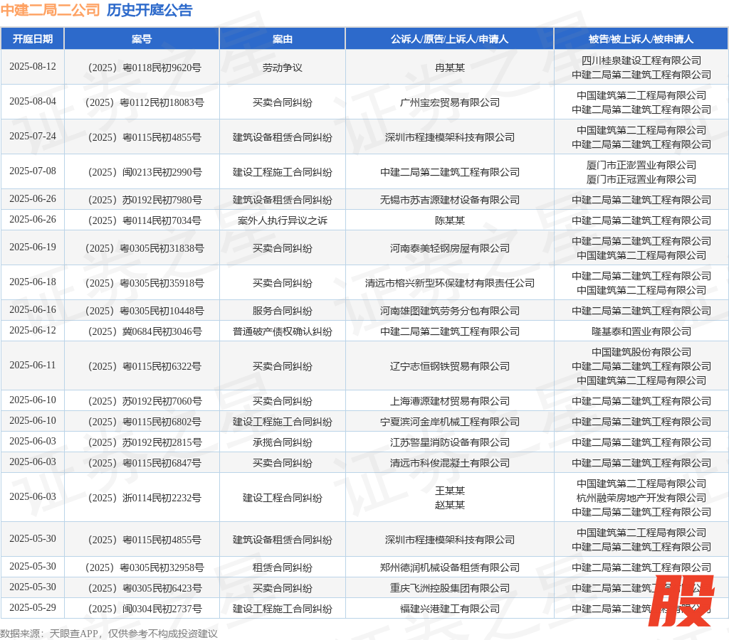 案号:(2025)粤0305民初35918号审理法院:广东省深圳市南山区人民法院案由:买卖合同纠纷当事人信息: 原告/上诉人:清远市榕兴新型环保建材有限责任公司 被告/被上诉人:中建二局第二建筑工程有限公司、中国建筑第二工程局有限公司开庭日期:2025年6月18日根据统计,近一年内以中建二局第二建筑工程有限公司为当事人的历史开庭公告有407则,其中案由为“买卖合同纠纷”的公告以124则居首,其次为“建筑设备租赁合同纠纷”有64则,“建设工程施工合同纠纷”有53则。历史开庭公告(前20条)如下: