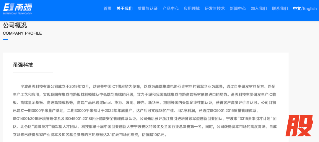 宁波甬强科技有限公司官网显示,该公司成立于2019年12月,主要研发生产IC载板、高端显示基板、高速高频载板等,高端产品已通过Intel、华为、浪潮、曙光等国内头部企业性能认证。
