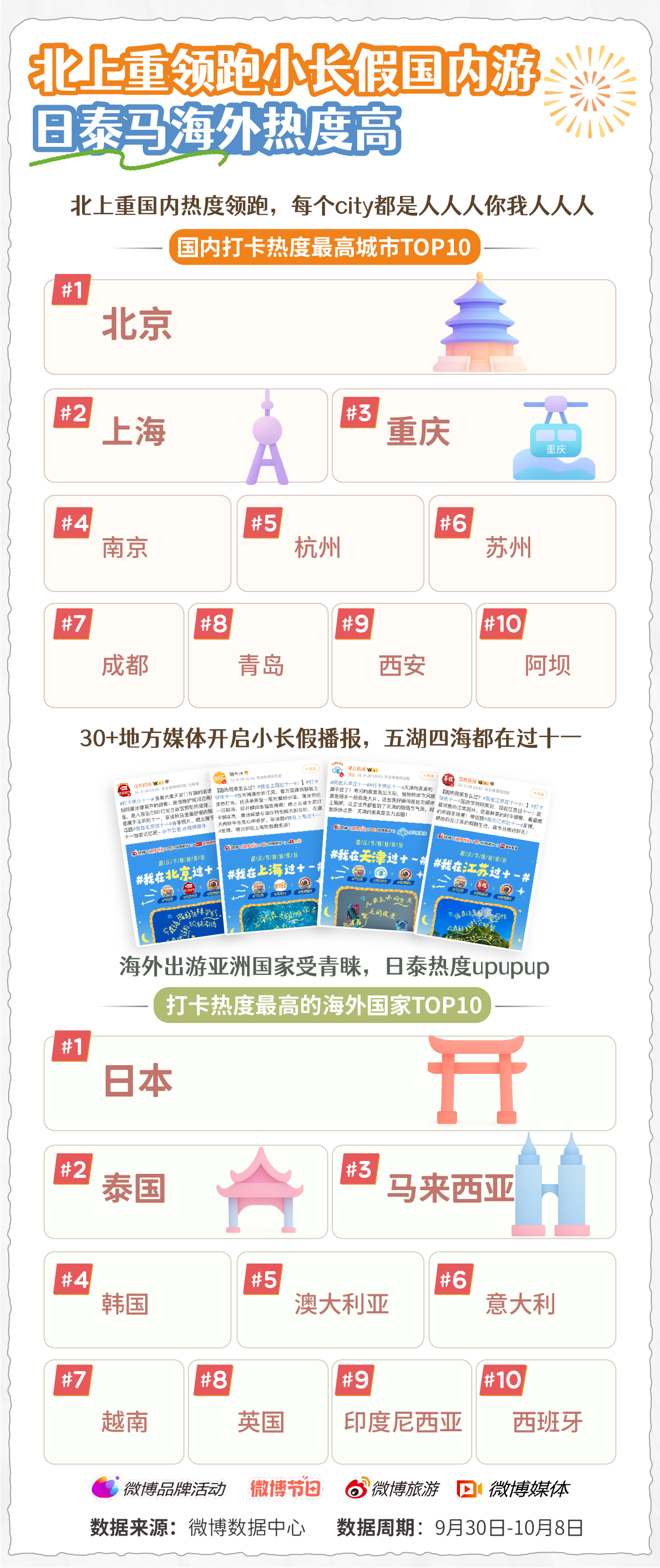 国庆小长假期间,国内游热度持续飙升。30+地方媒体开启小长假播报,五湖四海都在过十一。报告显示,北上重热度领跑全国,南京、杭州、苏州、成都、青岛、西安、阿坝等城市也入榜前十。从历史古都到现代都市,从山川壮美到江南水乡,祖国大地的多元魅力在小长假里充分展现。海外出游同样火热,亚洲国家受青睐,日本凭借便利的交通、丰富的文化体验稳居榜首,泰国、马来西亚等东南亚国家则以高性价比和热带风情吸引大批游客。同时,洲际长途旅游不少,欧洲的意大利、英国、西班牙跻身前十。在更长的假期里,旅行者们用慢节奏感受城市肌理,用镜头捕捉人文细节,在微博分享的不仅是风景,也是对世界的深情探索。