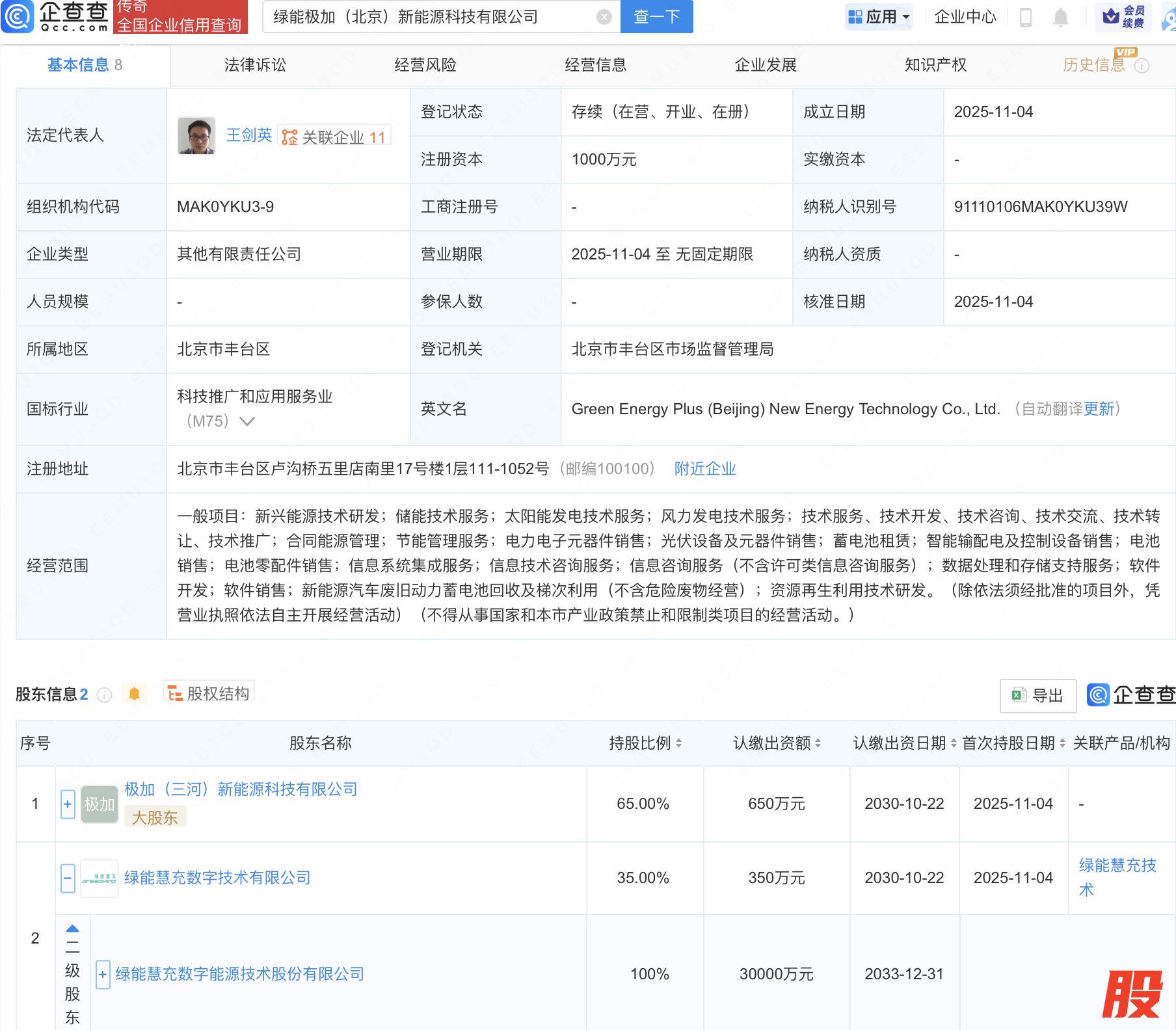 近日,绿能极加(北京)新能源科技有限公司成立,注册资本1000万元,经营范围包含:电力电子元器件销售;光伏设备及元器件销售;蓄电池租赁;智能输配电及控制设备销售等。企查查股权穿透显示,该公司由绿能慧充(600212)全资子公司绿能慧充数字技术有限公司等共同持股。