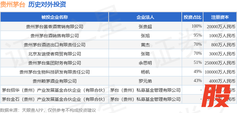 本站消息,根据天眼查APP显示,贵州茅台(600519.SH)新增一起对外投资事件,被投资公司为贵州茅台生物科技研发有限责任公司,法定代表人杨帆,投资占比为49%。该公司从事研究和试验发展,注册资本为100000万人民币。目前,贵州茅台共存在对外投资9项,详见下表: