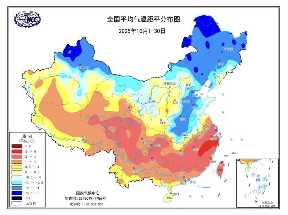 国家气候中心的数据显示,10月,气温“前暖后冷”,上旬气温为历史同期最高,南方地区出现“秋老虎”,江西、福建、浙江、湖南等地的部分地方日最高气温一度超过38℃。中下旬,随着3次冷空气过程影响中东部,气温转为偏冷,东北地区南部、华北东部和南部等地入冬偏早。